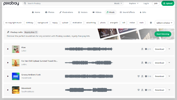 3) 저작권 문제 없음: 모든 음악이 저작권 없이 제공되어 저작권 문제를 걱정할 필요가 없습니다.