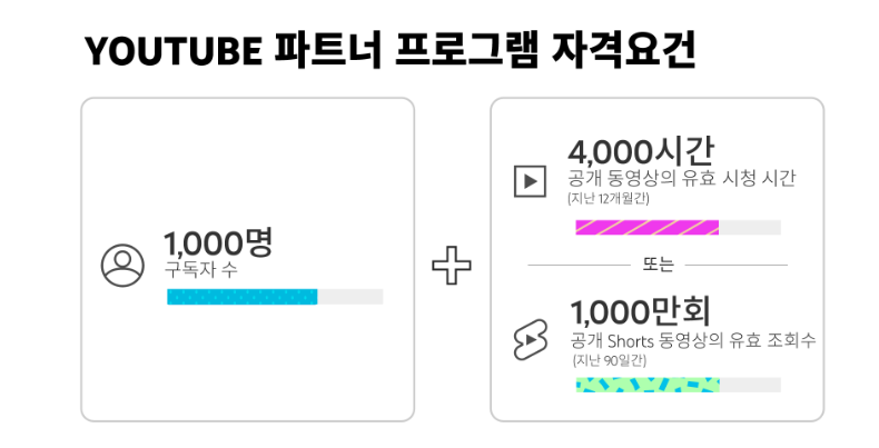 동영상의 누적 시청 시간이 최근 12개월 동안 4,000시간 이상이어야 합니다. 단, 쇼츠 시청 시간은 이 조건에 포함되지 않습니다.