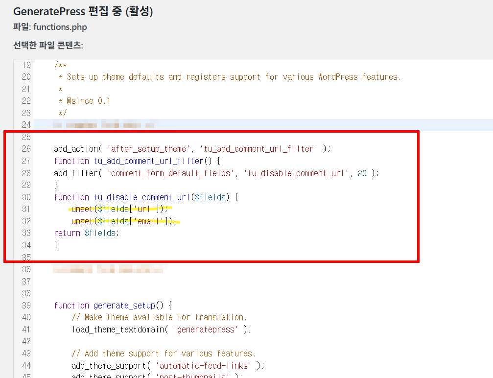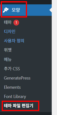 2. 워드프레스 관리자 > 모양(디자인) > 테마 파일 편집기 > Theme Functions(function.php)로 접속해서 아래 항목을 입력해줍니다.