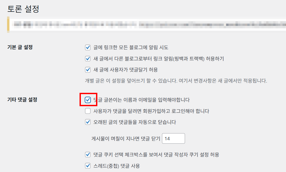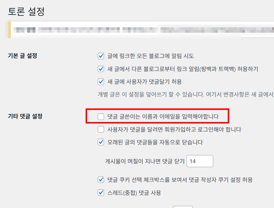 3. 아직 끝나지 않았어요^^. 이름 항목을 필수로 다시 바꿔줘야하니 워드프레스 관리자 > 설정 > 토론 > 기타 댓글 설정에 들어가서 "댓글 글쓴이는 이름과 이메일을 입력해야합니다"를 다시 체크해주고 저장해주세요.